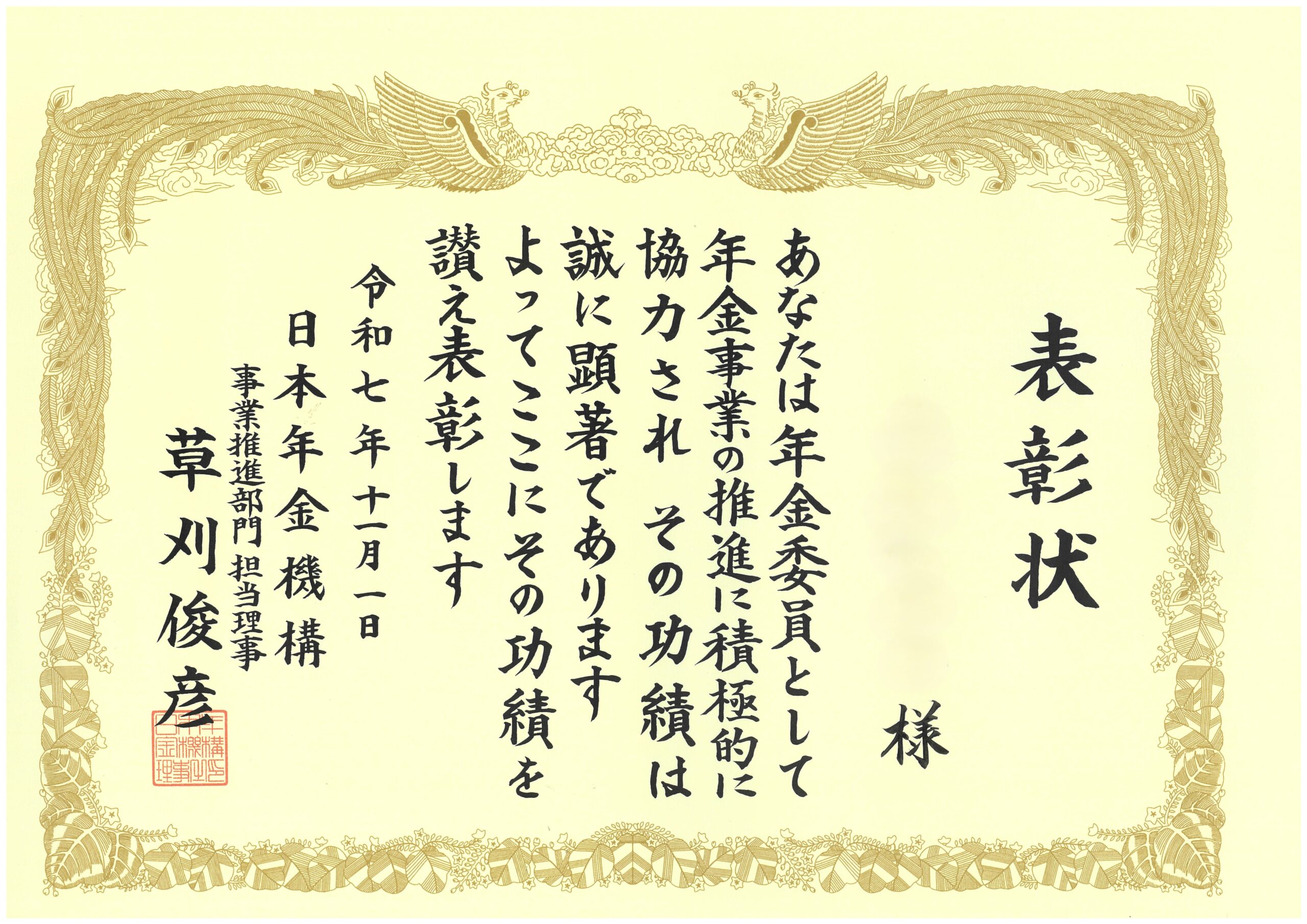 当社担当者が日本年金機構理事より表彰を授与されました