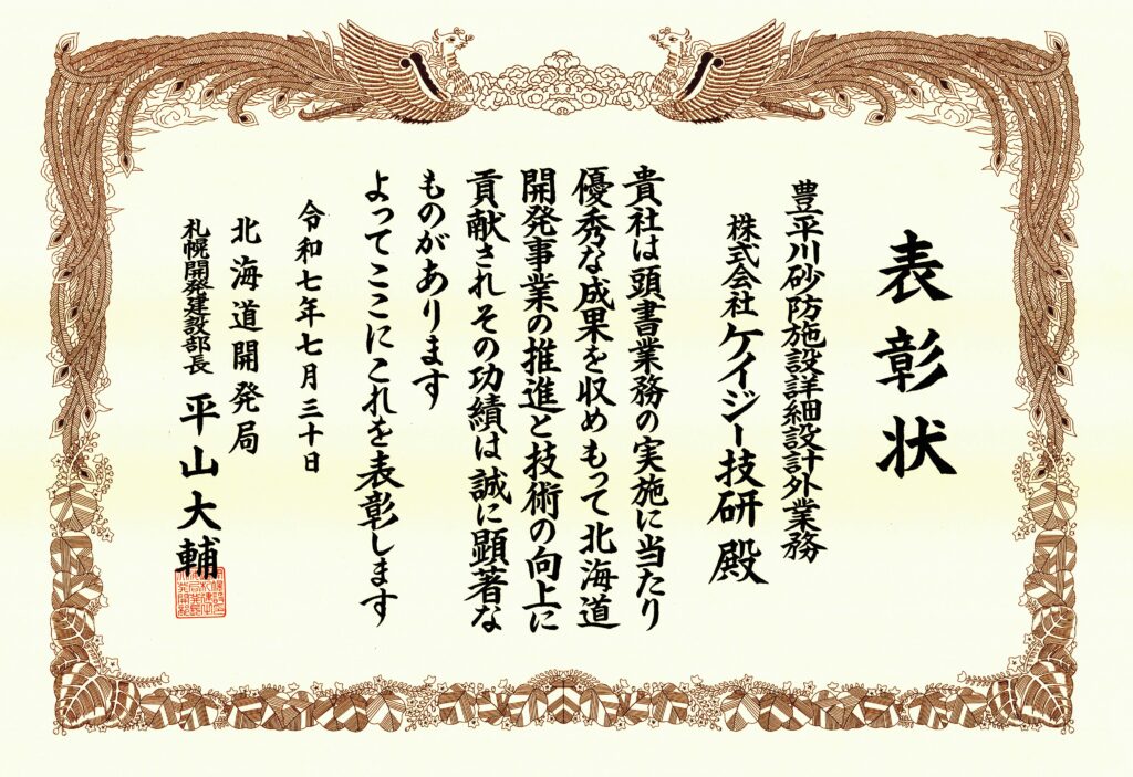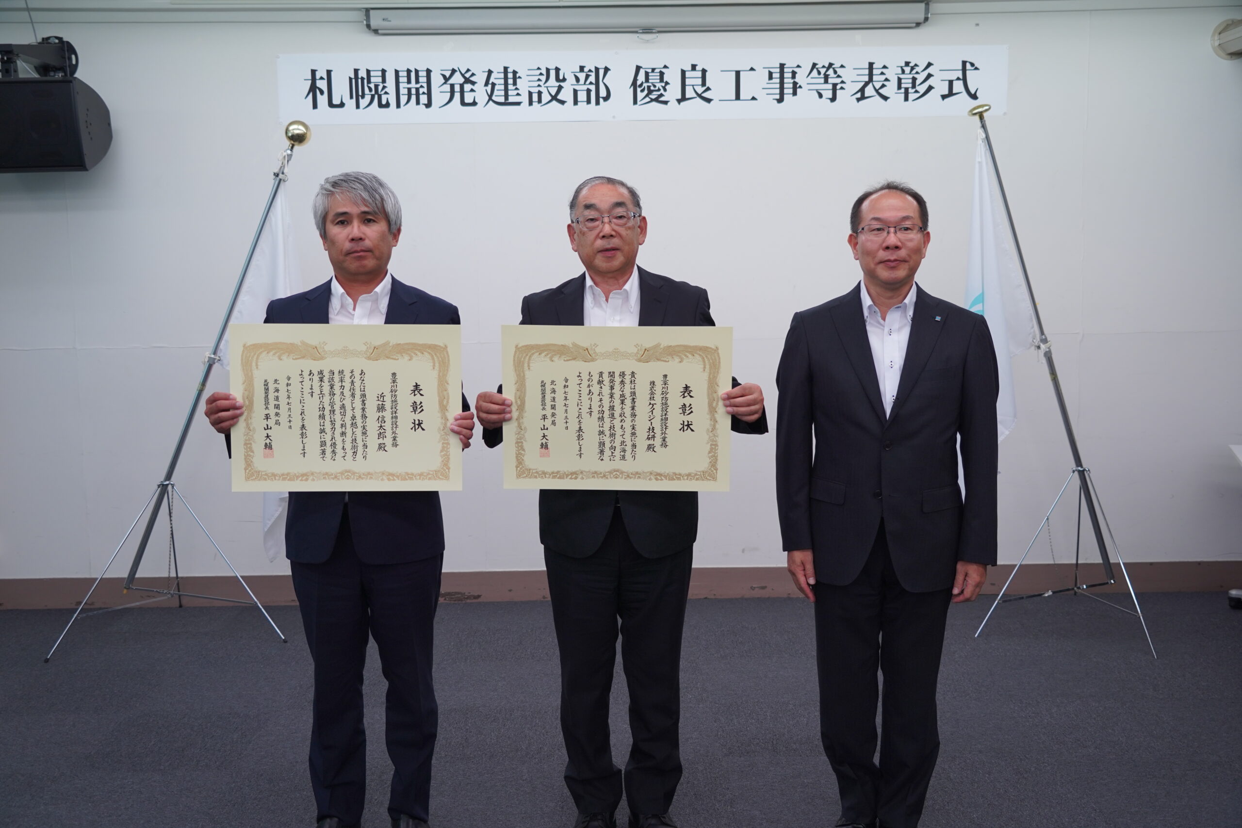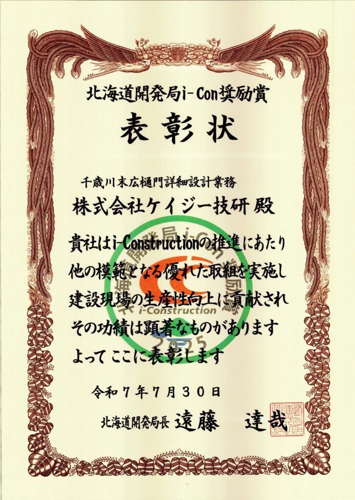 札幌開発建設部 優良工事等表彰 / 北海道開発局i-Con奨励賞表彰を受けました 投稿日 2025年8月6日 ◆令和7年度 北海道開発局 札幌開発建設部 優良工事等表彰 / 業務名:豊平川砂防施設詳細設計外業務 ~ 2025年7月30日 北海道開発局札幌開発建設部にて ~ ◆北海道開発局 i-Con奨励賞2025表彰 / 業務名:千歳川末広樋門詳細設計業務 ~ 2025年7月30日 北海道開発局 札幌第1合同庁舎にて ~